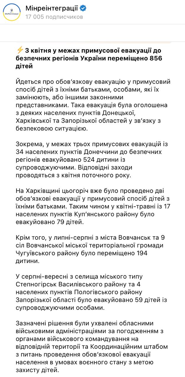 Речь идет об обязательной эвакуации принудительным образом детей с их родителями, заменяющими их лицами или другими законными представителями. Такая эвакуация была объявлена из некоторых населенных пунктов Донецкой, Харьковской и Запорожской областей по соображениям безопасности.