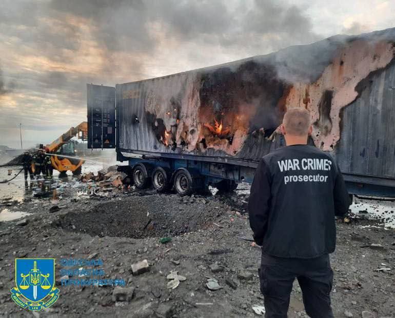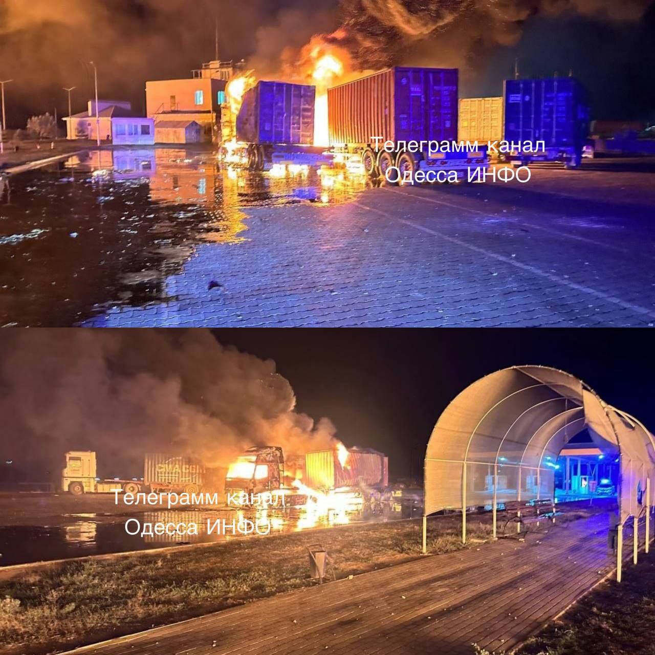 09.45 Последствия прилетов по Орловке в Одесской области, где под удар попали фуры и пострадала переправа через Дунай.