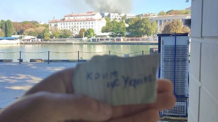 Российские силовики задержали мужчину, который сфотографировал, как держит в руке бумажку с надписью "Крым - это Украина" на фоне горящего штаба Черноморского флота РФ после ракетного удара по Севастополю 22 сентября.
