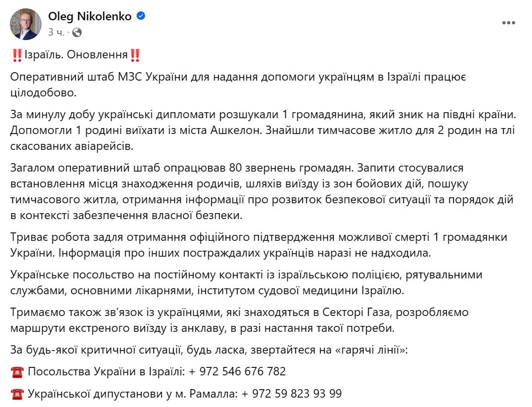 Также представитель МИД Олег Николенко сообщил, что украинские дипломаты разыскали одного гражданина Украины, пропавшего на юге Израиля. При каких обстоятельствах его нашли - не сообщается.