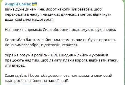 "Война очень динамичная. Враг накапливает резервы, чтобы переходить в наступление на некоторых участках с целью оттянуть дополнительные силы нашей армии. В других направлениях Силы обороны продолжают движение вперед", - написал глава ОП.