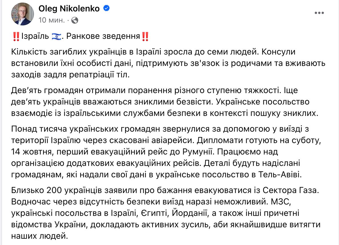 Девять граждан ранены, еще девять считаются пропавшими без вести. Их ищут в сотрудничестве с израильскими службами безопасности. Уже более тысячи украинцев хотят, но не могут улететь из Израиля из-за отмененных авиарейсов. На субботу готовится первый эвакуационный рейс в Румынию.