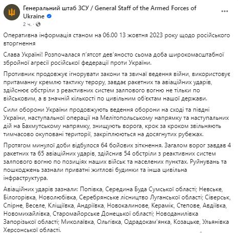Утром 13 октября Генштаб ВСУ обнародовал сводку о ситуации на фронте.