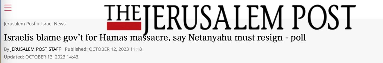 Четверо из каждых пяти респондентов в Израиле (или 86%) возлагают ответственность за неспособность Израиля предотвратить население ХАМАС на правительство Нетаньяху.