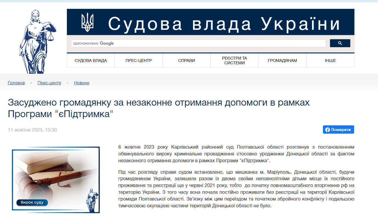 Карловский суд в Полтавской области приговорил к 1 году лишения свободы женщину из Мариуполя, у которой на содержании 7 детей, за незаконное получение 8 тысяч гривен по программе "Е-поддержка".