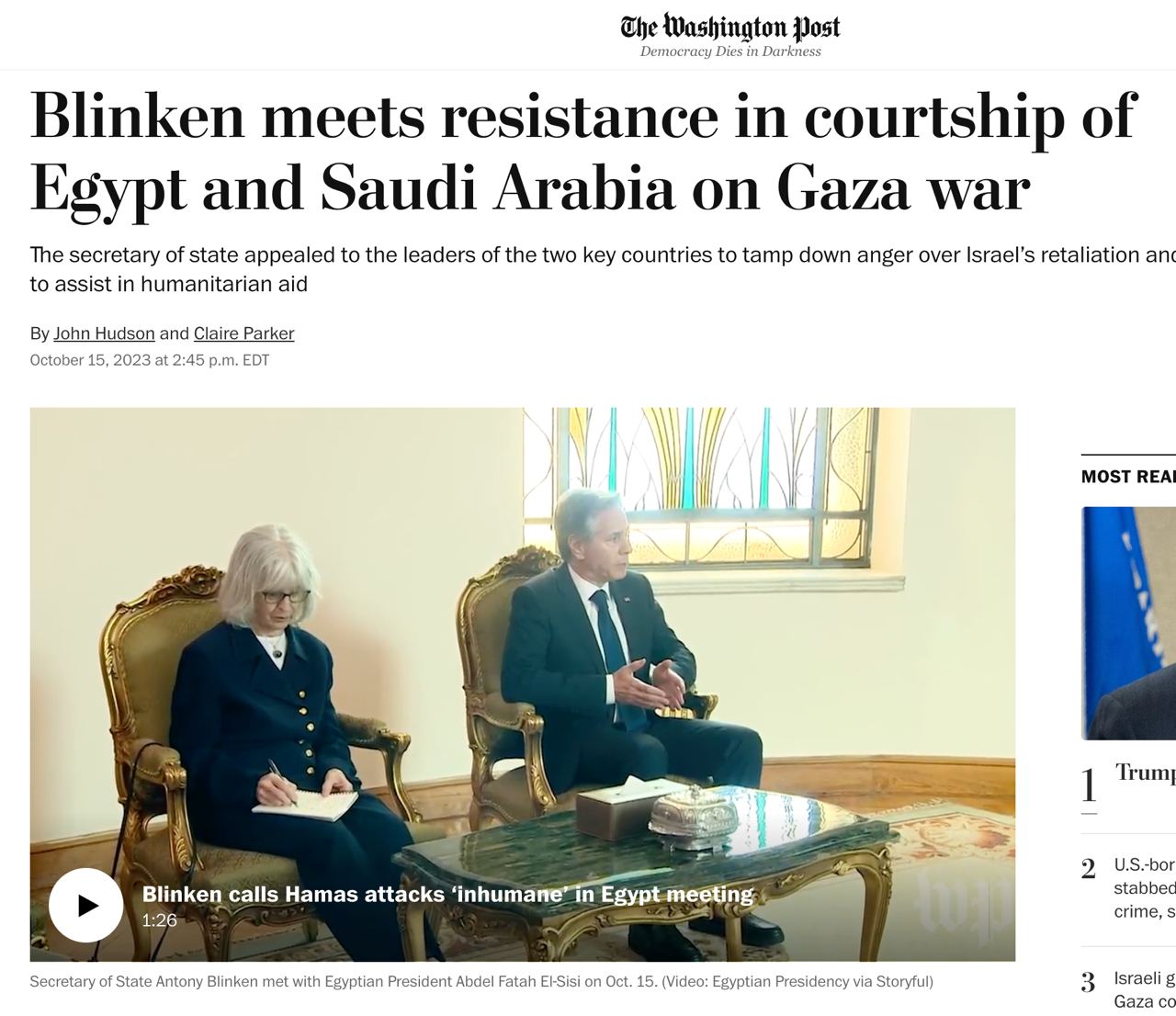 Госсекретарь США Энтони Блинкен "столкнулся с ожесточенным сопротивлением самых влиятельных лидеров арабского мира", в чьих странах есть "глубокие общественные симпатии к палестинскому делу", - Египта и Саудовской Аравии.