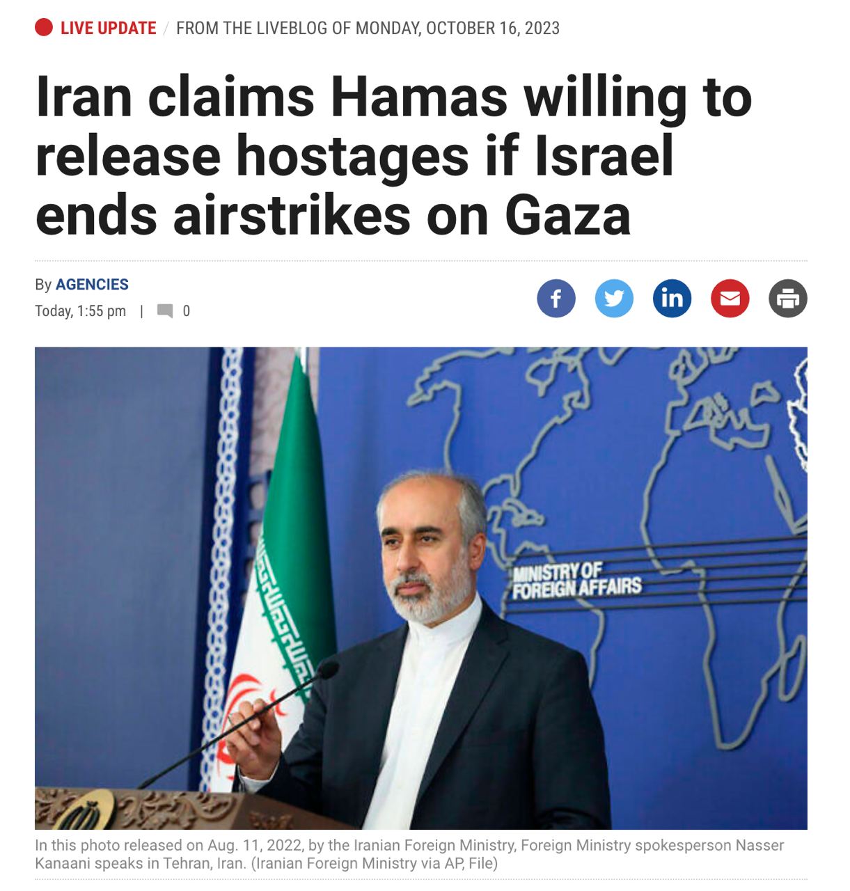 По словам официального представителя МИД Ирана Нассера Канаани, представители ХАМАСа "заявляли, что они готовы принять необходимые меры для освобождения граждан и мирных жителей, удерживаемых группами сопротивления, но их точка зрения заключалась в том, что такие меры требуют подготовки, которая невозможна в условиях ежедневных бомбардировок сионистов различных частей Газы".