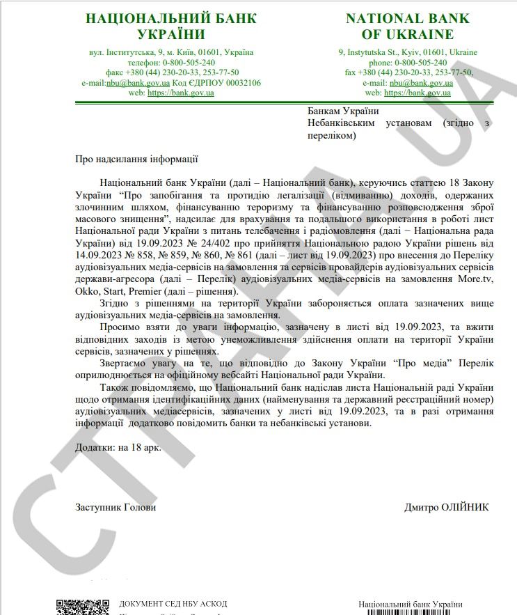В нем регулятор ссылается на письмо Национального совета Украины по вопросам телевидения и радиовещания №24/402 от 19.09.2023, которым онлайны были внесены в "Перечень аудиовизуальных медиа-сервисов на заказ и провайдеров аудиовизуальных сервисов государства-агрессора".