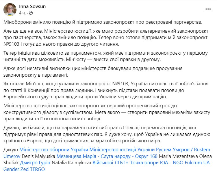 "Минобороны изменило позицию и поддержало законопроект о зарегистрированном партнерстве. Но это еще не все. Минюст, который должен был подготовить законопроект об альтернативном партнерстве, тоже изменил свою позицию. Теперь готов поддержать мой законопроект №9103 и готовит к нему поправки во втором чтении", - написала депутат.