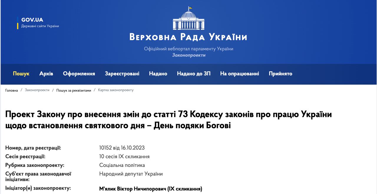 Законопроект №10152 предлагает установить новый межконфессиональный праздник под названием "День благодарения Богу", который будет отмечаться в последнее воскресенье сентября.