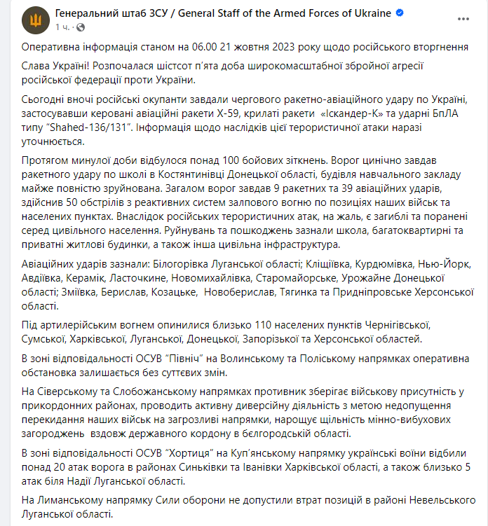 Война в Украине идет уже 605-й день. Мы следим за последними новостями и ключевыми событиями 21 октября 2023 года в обновляемом онлайне.