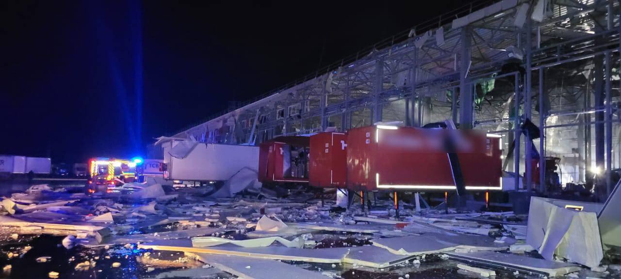 В ГСЧС сообщили, что в результате удара произошло значительное разрушение здания терминала, повреждены 7 грузовых автомобилей и 2 полуприцепа. Также на объекте произошел пожар на площади около 300 кв.