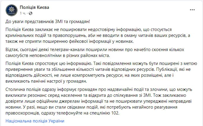 "Сегодня некоторые телеграм-каналы распространили новости о якобы совершении нескольких самоубийств несовершеннолетними в разных районах города. Полиция Киева опровергает эту информацию. Такие сообщения могут быть распространены для привлечения внимания и увеличения количества читателей соответствующих ресурсов. Не соответствующие действительности публикации не только компрометируют ресурсы, на которых размещены, но и вызывают панические настроения у граждан", - сказано в посте.
