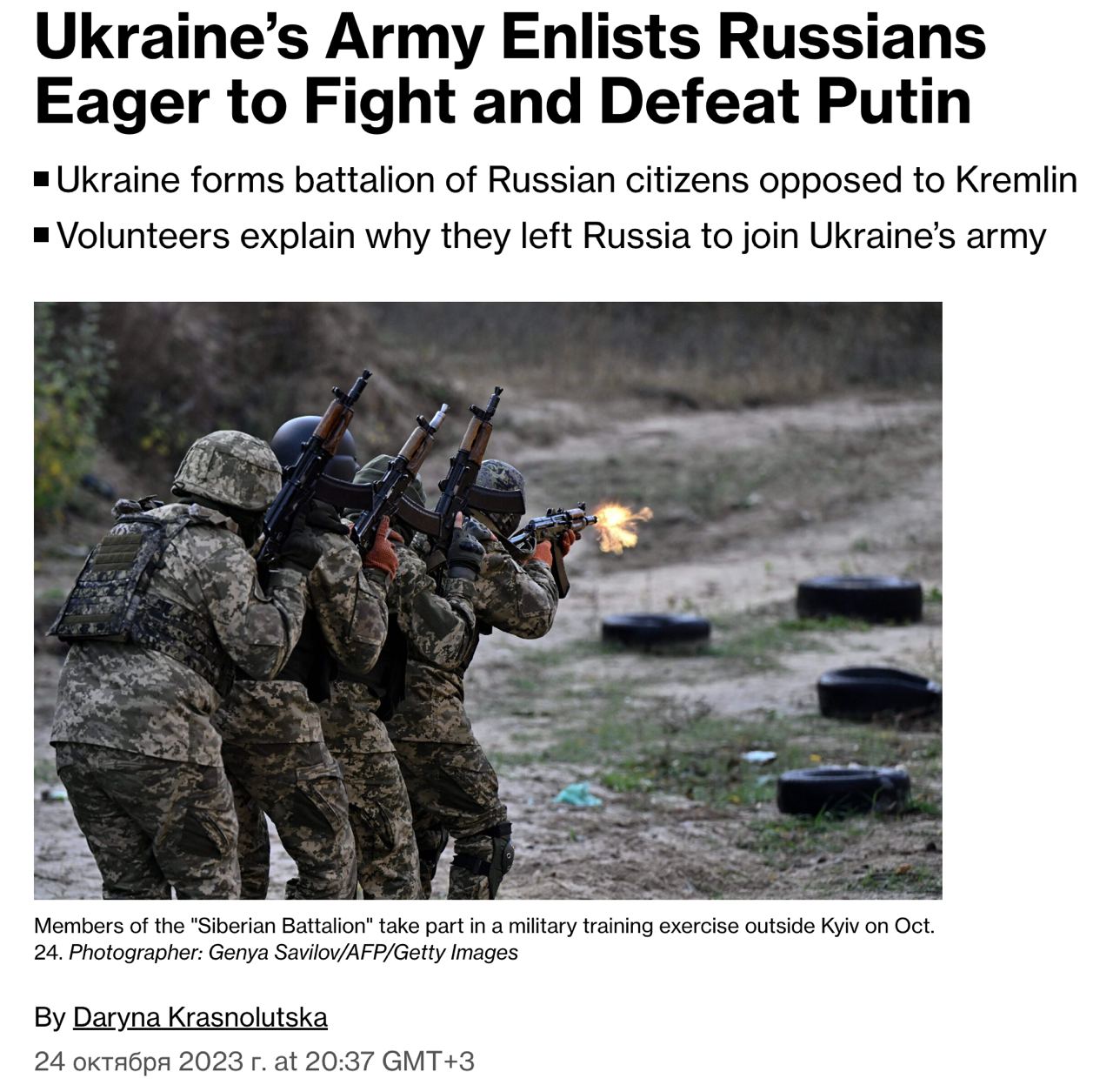 10.17 Украина сформировала батальон "Сибирь", полностью состоящий из граждан РФ, желающих бороться против вторжения РФ, пишет Bloomberg.