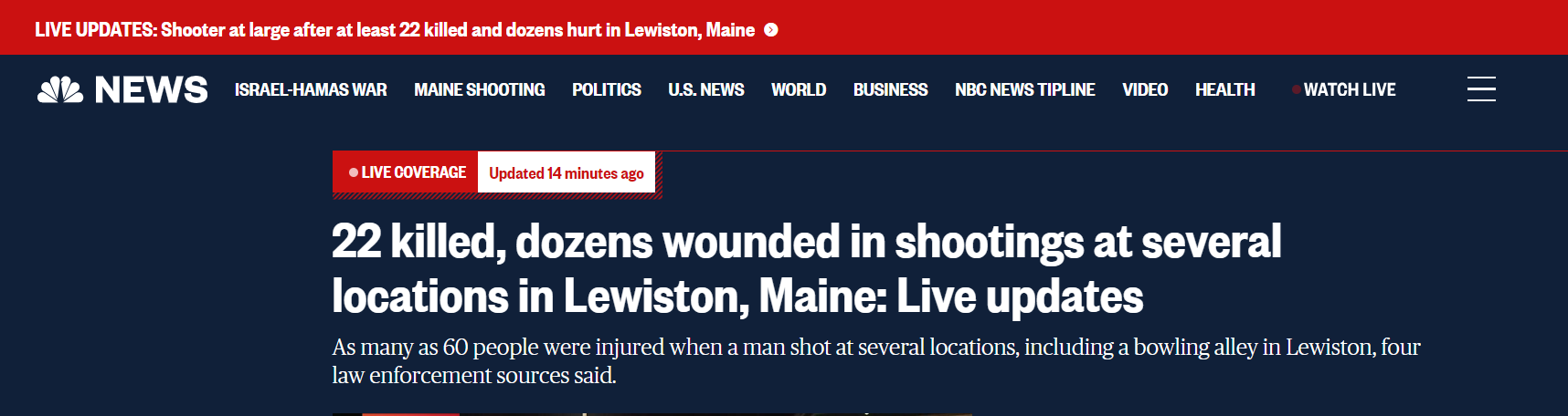 Сегодня ночью неизвестный устроил массовую стрельбу в городе Льюистон, штат Мэн, США. Погибли по меньшей мере 22 человека, ранены от 50 до 60 человек.