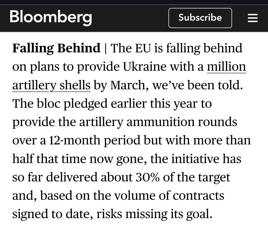 Минувшей весной ЕС обязался поставить артиллерийские боеприпасы в течение 12-месячного периода. Но уже прошло более половины этого срока, и за это время удалось прислать Киеву лишь 30% от обещанного.