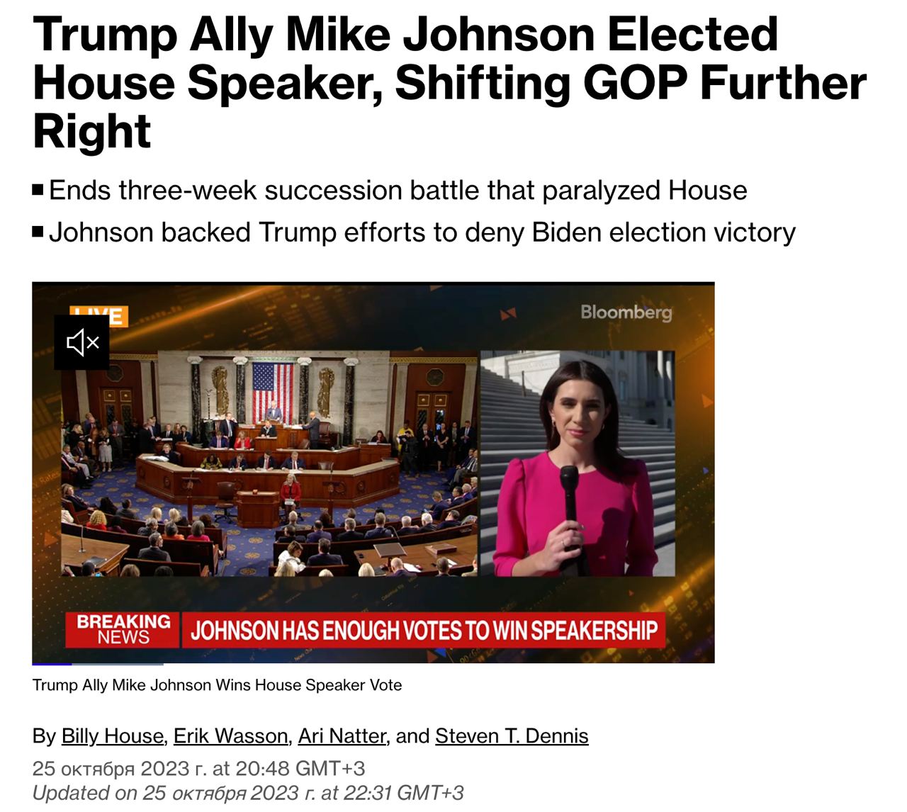 Напомним, 25 октября республиканец Майк Джонсон избран спикером Палаты представителей США. За 51-летнего Джонсона с первого раза проголосовали все 220 присутствующих республиканцев. По профессии новый спикер адвокат, специализирующийся на конституционном праве.