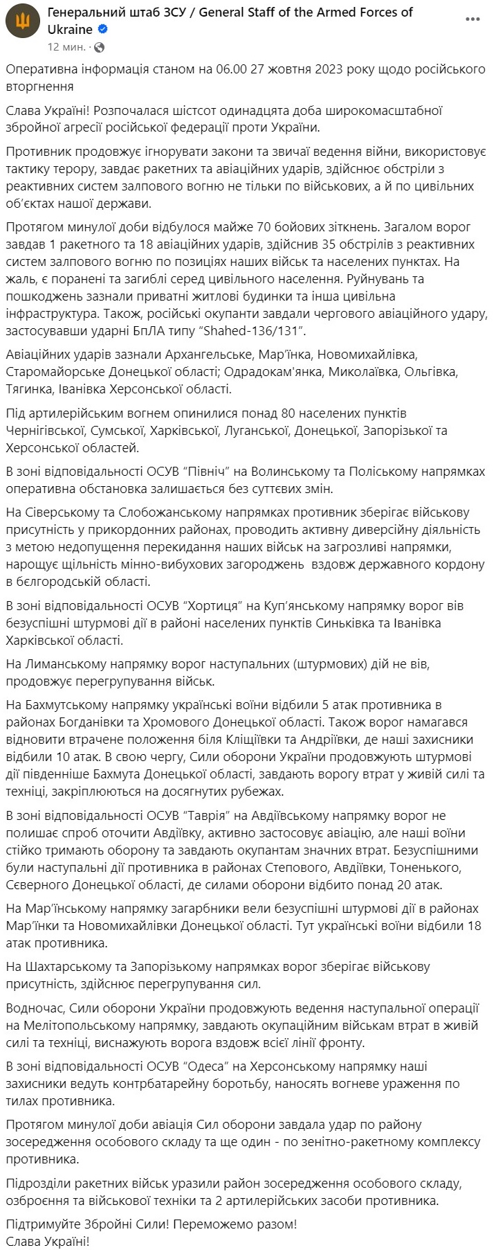 За прошедшие сутки произошло почти 70 боевых столкновений. Всего россияне нанесли 1 ракетный и 18 авиационных ударов, совершили 35 обстрелов из реактивных систем залпового огня по позициям наших войск и населенным пунктам.