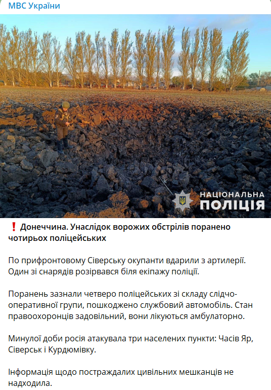 14:25 В результате обстрела РФ в Донецкой области ранены четыре полицейских. По прифронтовому Северску оккупанты ударили из артиллерии, один из снарядов разорвался у экипажа полиции