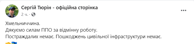 "Спасибо силам ПВО за отличную работу. Пострадавших нет. Повреждений гражданской инфраструктуры нет", - написал он.