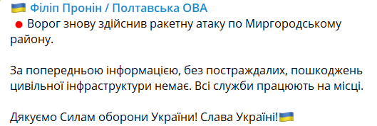07:51 Ночью Россия нанесла ракетный удар по Миргородскому району Полтавской области.
