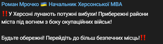 07:57 Сегодня утром в Херсоне были слышны мощные взрывы, сообщил руководитель ГВА Роман Мрочко. Под обстрелом прибрежные районы города.