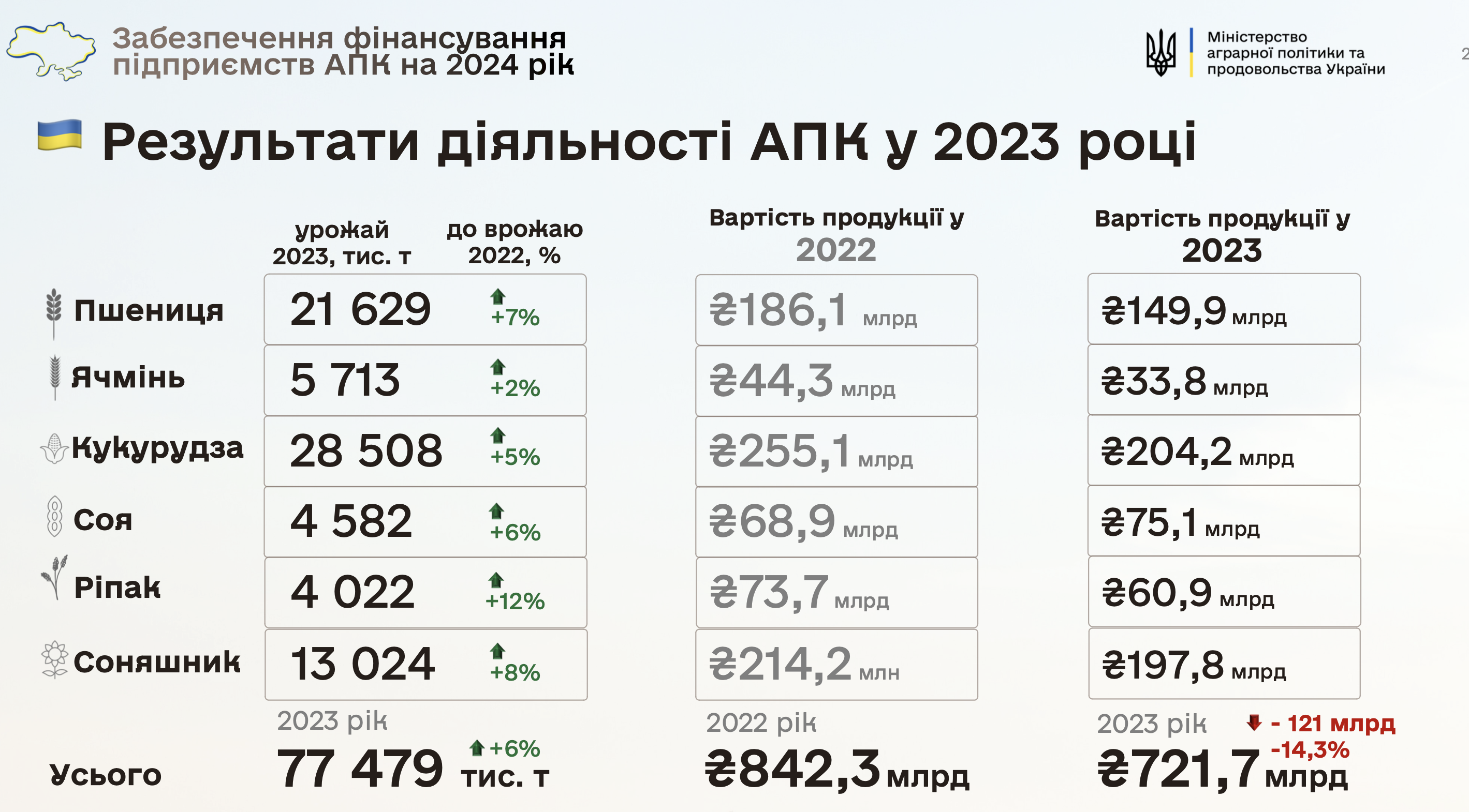 Больше получить удалось только за сою: в прошлом году урожай стоил 68,9 млрд, в этом - 75,1 млрд. Но общую ситуацию это не спасло. По всему урожаю, стоимость которого в прошлом году оценивалась в 842,3 млрд гривен, в этом году сумма всего 721,7 млрд, или минус 14,3%, а это 121 млрд гривен.