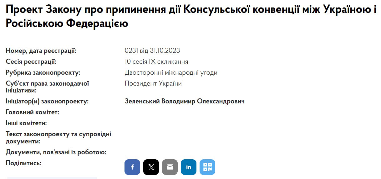 Соответствующий законопроект о прекращении действия консульской конвенции между Украиной и Российской Федерацией появился на сайте парламента.