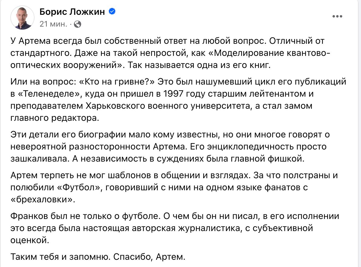 "Его энциклопедичность просто зашкаливала. А независимость в суждениях была главной фишкой. Артем терпеть не мог шаблонов в общении и взглядах. За что полстраны и полюбили "Футбол", говоривший с ними на одном языке фанатов с "брехаловки". Франков был не только о футболе. О чем бы он ни писал, в его исполнении это всегда была настоящая авторская журналистика, с субъективной оценкой", - поделился воспоминаниями о Франкове Ложкин.