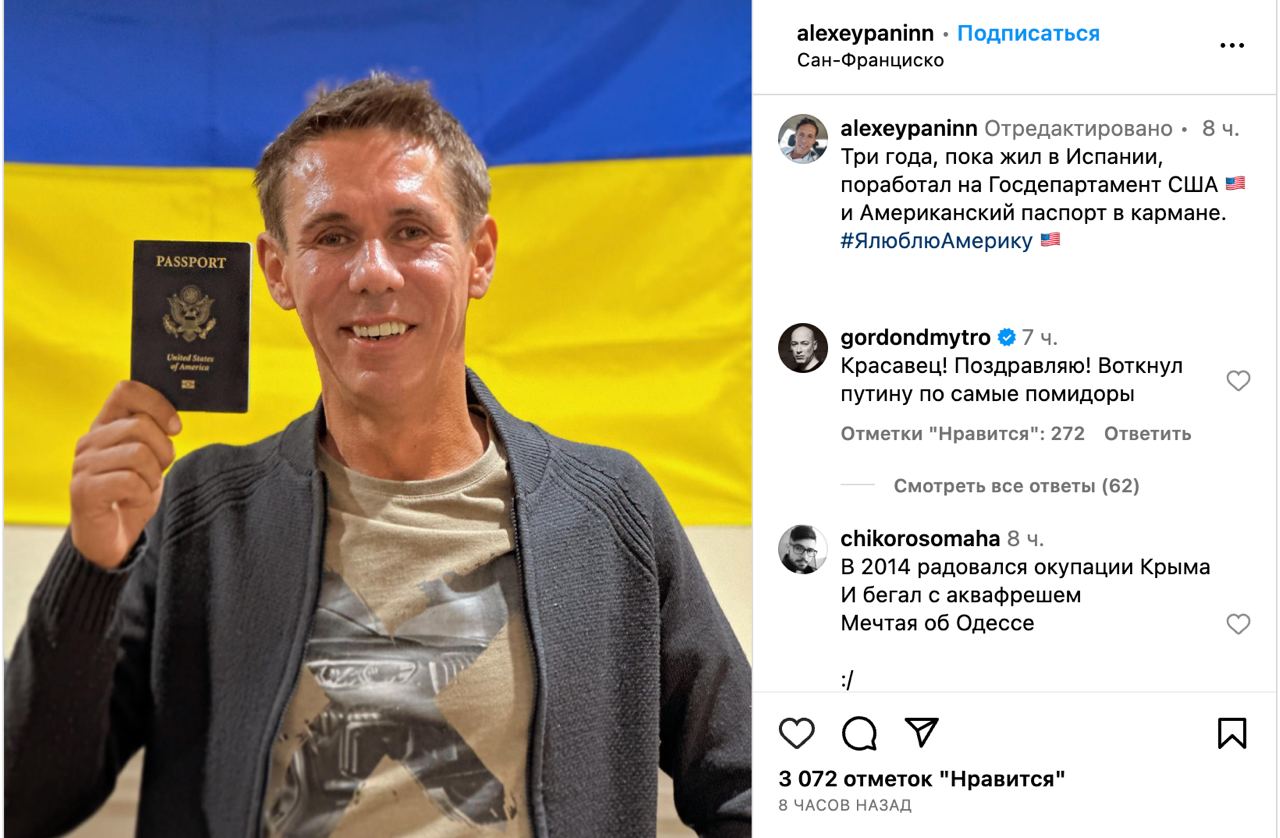 "Три года, пока жил в Испании, поработал на Госдепартамент США - и американский паспорт в кармане", - написал Панин и сопроводил сообщение хештегом "ЯлюблюАмерику".
