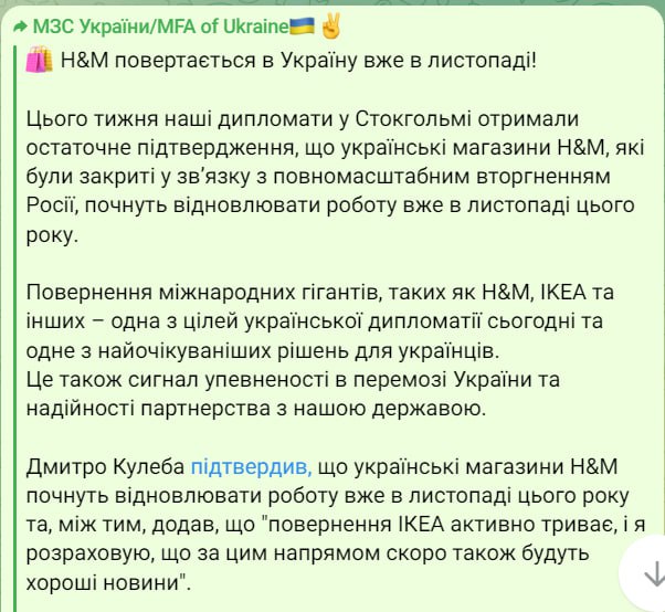 "Возвращение международных гигантов, таких как H&M, IKEA и другие – одна из целей украинской дипломатии сегодня и одно из самых ожидаемых решений для украинцев", — пишет МИД.
