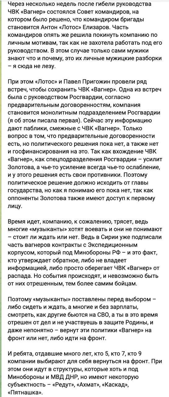 Журналистка связывает это с тем, что многие в окружении Путина не хотят усиления позиций главы Росгвардии Виктора Золотова. Поэтому пока "вагнеровцы" находятся в подвешенном состоянии. Некоторые из них уже уехали в Сирию по контракту с Минобороны РФ. Другие отдельно или мелкими группами вливаются в другие формирования в структуре МО РФ или Росгвардии: "Редут", "Ахмат", "Каскад" или "Пятнашка".