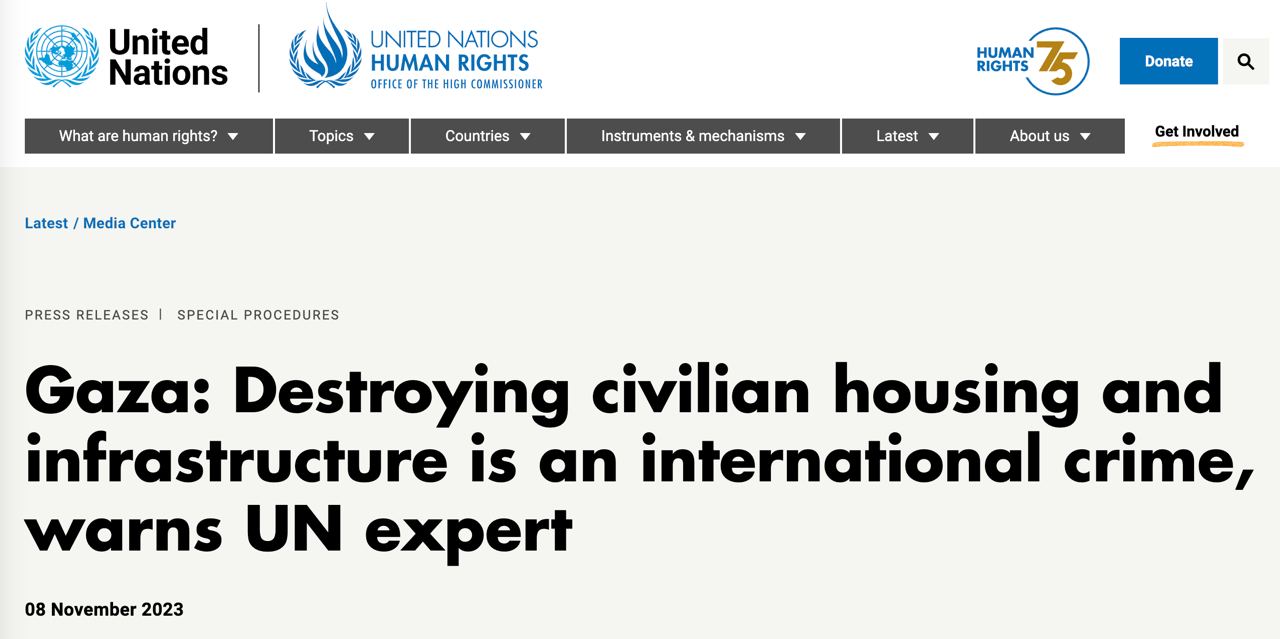 «Проведение боевых действий с осознанием того, что они будут систематически разрушать и наносить ущерб жилью и инфраструктуре гражданского населения, делая целый город, например, город Газа, непригодным для проживания для гражданского населения, является военным преступлением», — заявил специальный докладчик ООН по праву на достаточное жилье Балакришнан Раджагопал.