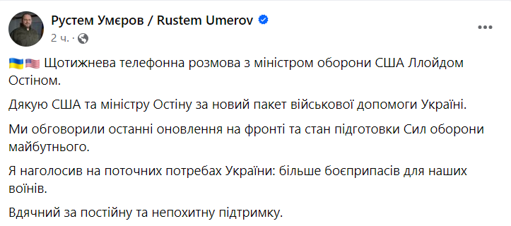 Министр обороны Украины Рустем Умеров сообщил, что провел еженедельный телефонный разговор с главой Пентагона Ллойдом Остином. Обсудили текущие потребности Украины, в частности больше боеприпасов для наших солдат.