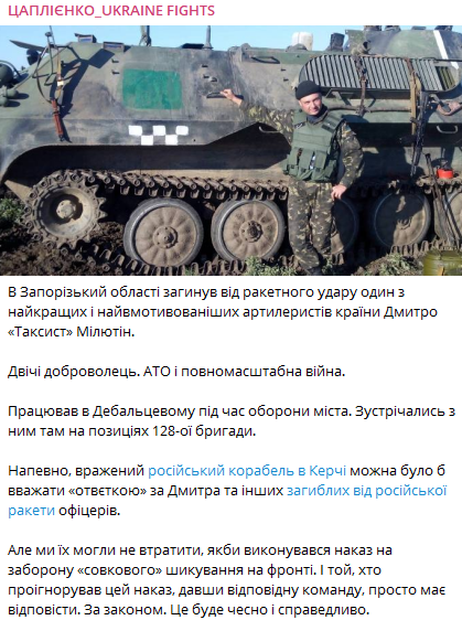 Во время российского удара "Искандером" погиб один из лучших артиллеристов Украины Дмитрий Милютин с позывным "Таксист".