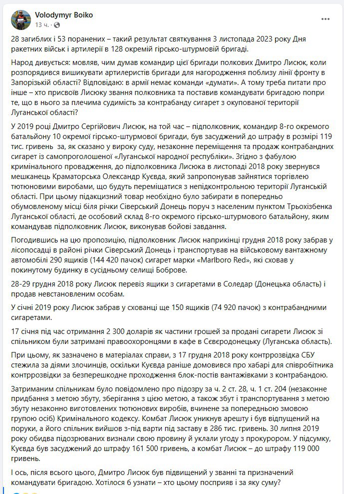 Также Бойко пишет о том, что комбриг Лысюк опоздал на построение, по которому нанесли удар россияне - поэтому остался жив. Он приехал буквально через несколько минут после удара.