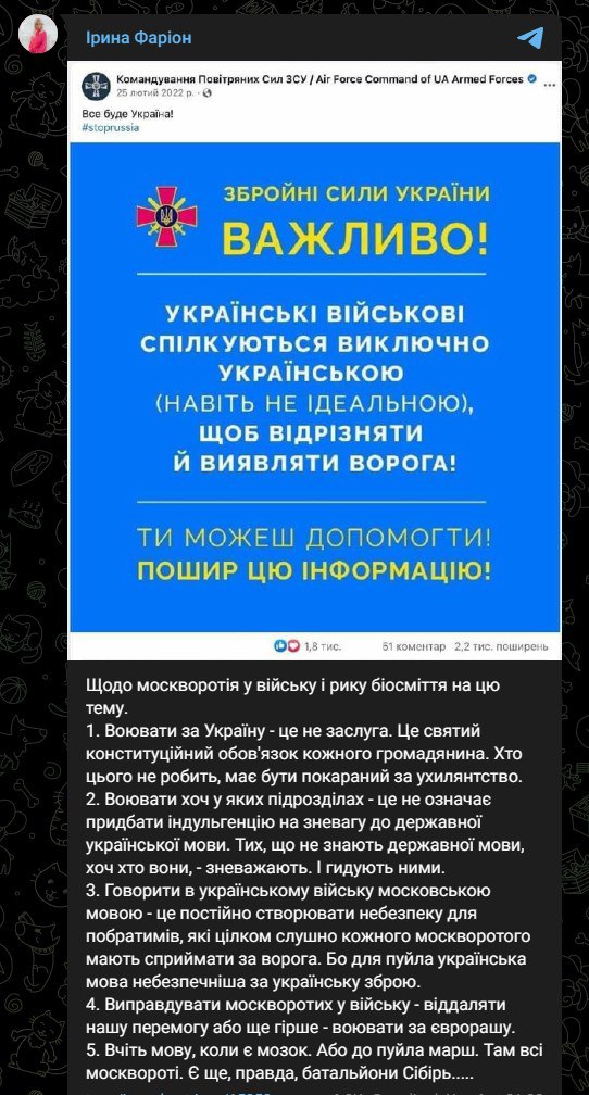 По словам Фарион, украиноязычные военные "каждого москворотого должны воспринимать как врага". Также она считает, что русскоязычных в армии нужно "презирать".