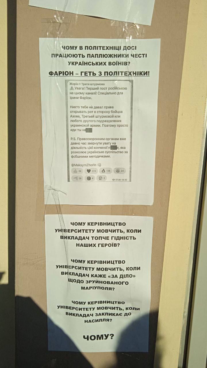 "Почему в "Политехнике" до сих пор работают те, кто порочит украинских воинов? Фарион, прочь из "Политехники"! Почему руководство университета молчит, когда преподаватель топчет достоинство наших героев? Почему руководство университета молчит, когда преподаватель говорит "За дело" относительно разрушенного Мариуполя? Почему руководство университета молчит, когда преподаватель призывает к насилию? Почему?" - говорится в листовке.