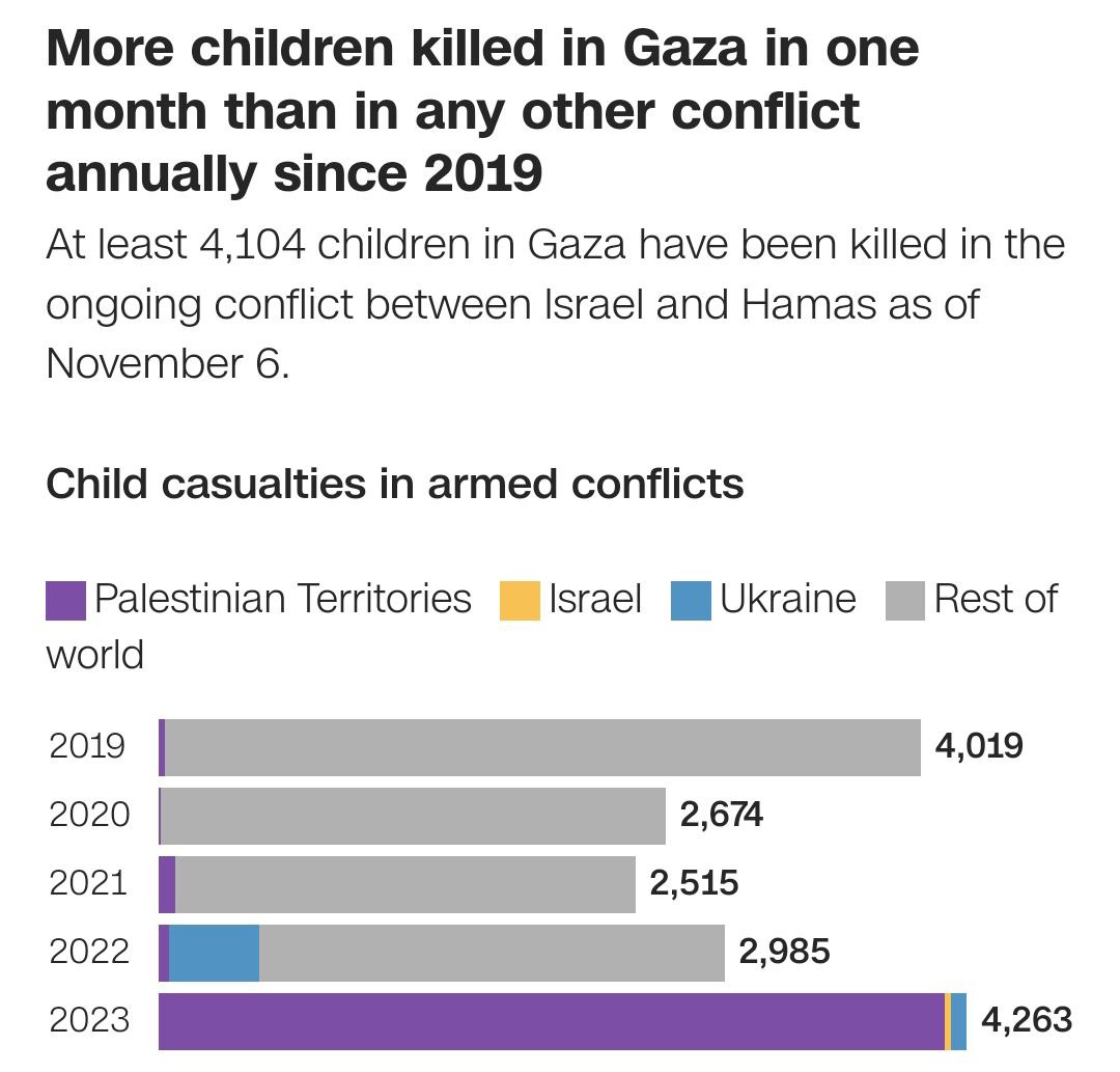 За месяц войны там погибли 4 104 ребенка, что составляет чуть менее половины от всех смертей в Газе.