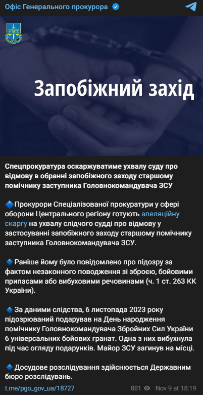"Прокуроры Специализированной прокуратуры в сфере обороны Центрального региона готовят апелляционную жалобу на определение следственного судьи об отказе в применении меры пресечения старшему помощнику заместителя главнокомандующего ВСУ", — говорится в сообщении.