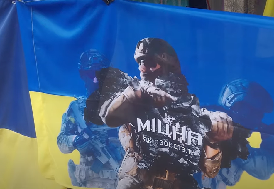 На рынке среди продуктов представлен огромный выбор украинских флагов — как ВСУ, там и добровольческих батальонов. Цена — 275 гривен.