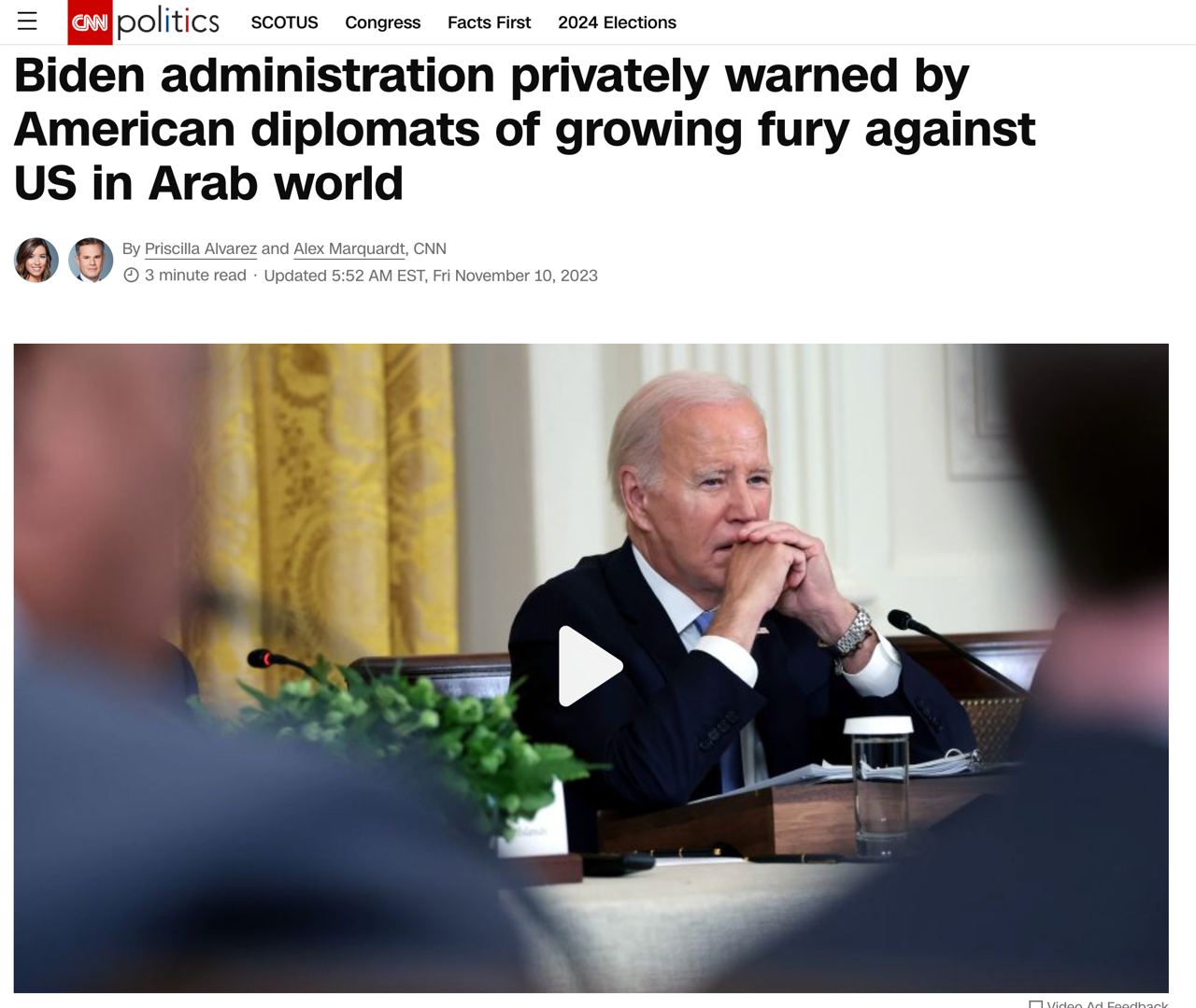 CNN напоминает, что на недавнем саммите с участием главы Госдепа Энтони Блинкена арабские лидеры призвали к немедленному прекращению огня в секторе Газа, а госсекретарь вновь заявил о несогласии США, заявив, что это даст ХАМАС время перегруппироваться и начать новое нападение на Израиль.