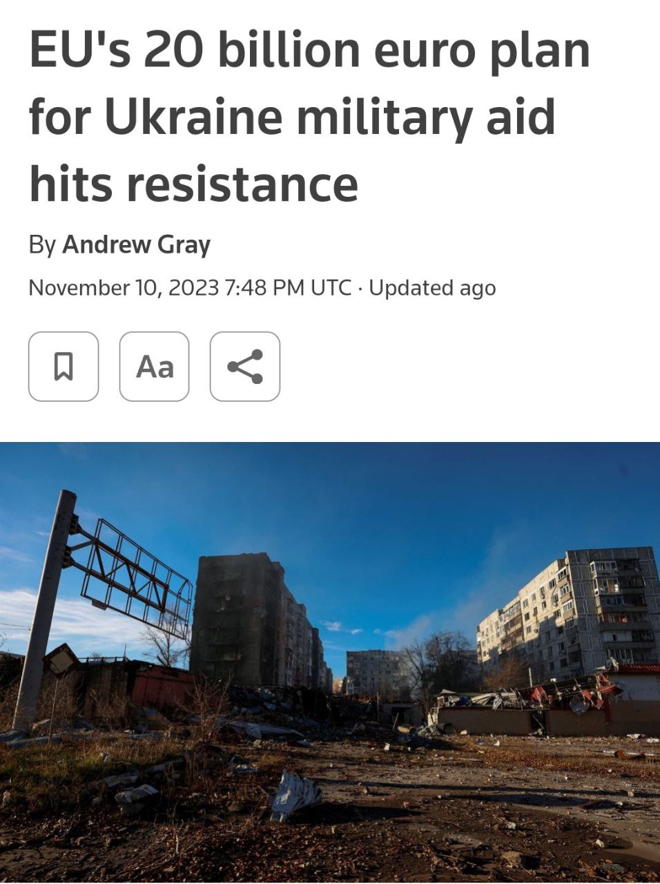План ЕС потратить 20 миллиардов евро на военную помощь Украине "встречает сопротивление" внутри блока "и может не выжить в своем нынешнем виде".