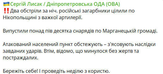 "Выпустили более полудесятка снарядов по Марганецкой громаде", - написал он.
