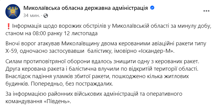 09:07 Ночью войска РФ атаковали Николаевскую область двумя управляемыми авиационными ракетами типа Х-59, одновременно применив баллистику, предположительно "Искандер-М".