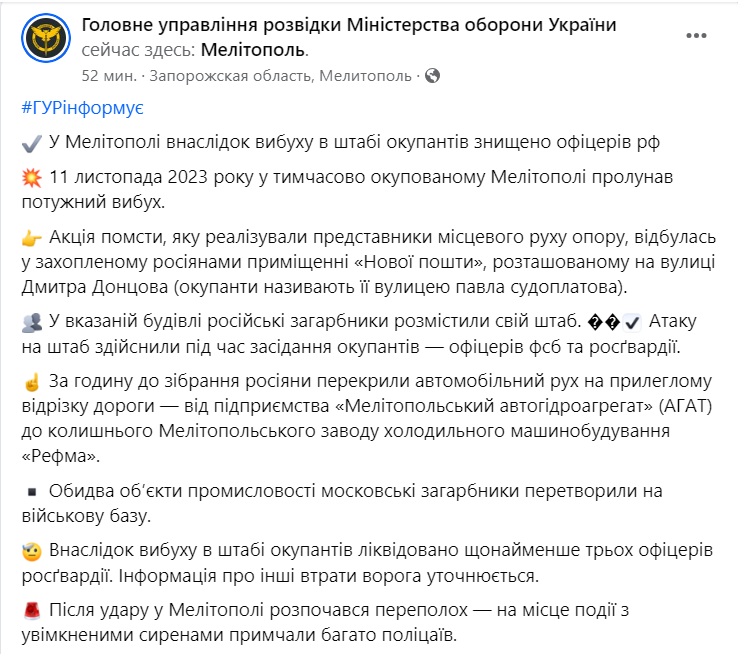 15:26 Вчера в оккупированном Мелитополе подорвали российский штаб. В результате взрыва были уничтожены три офицера России.