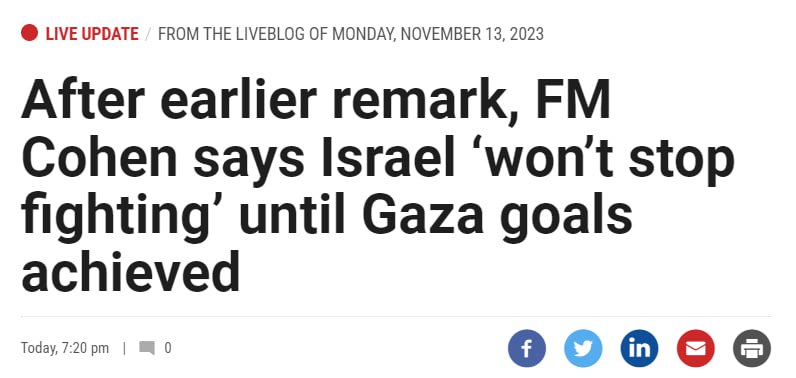 Израильский министр иностранных дел Эли Коэн заявил, что у Израиля есть около двух-трех недель до того, как международное сообщество резко усилит давление из-за военной операции в Газе.
