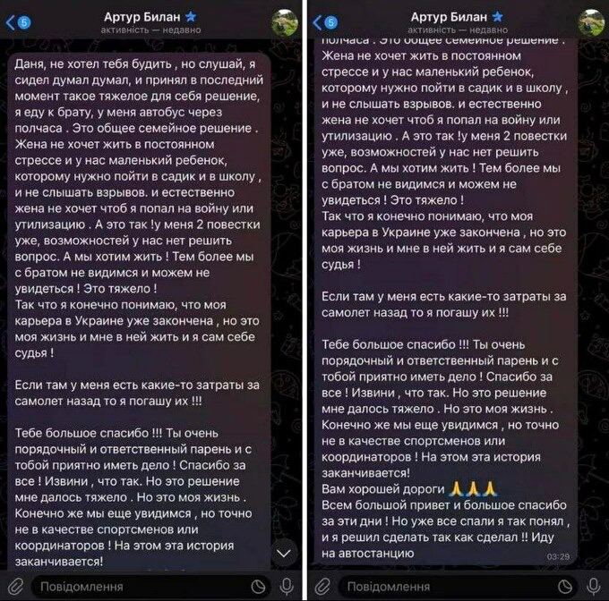 Об этом сообщил капитан украинской сборной Даниил Лясов, опубликовав в соцсетях скриншот сообщения Билана.