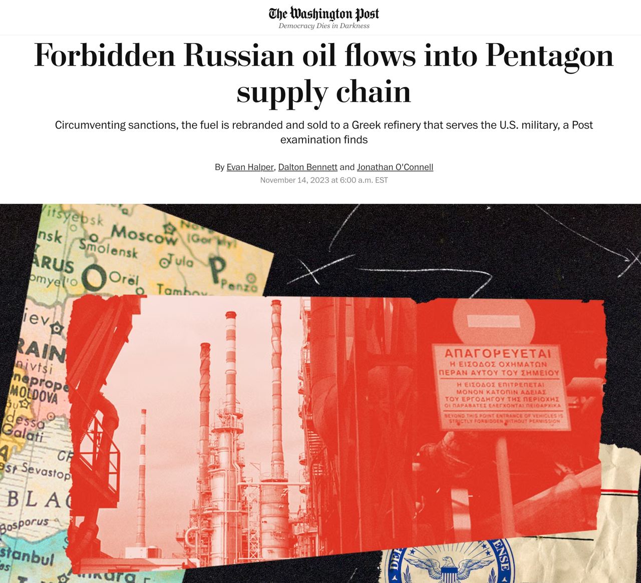 Греческое предприятие заявило инвесторам, что прекратило принимать запрещенную нефть и вместо этого нашло другие источники. Однако эксперты уверены, что мазут, который Пентагон закупает для кораблей и самолетов, содержит российскую нефть. По их оценкам, после введения западных санкций российские поставки в турецкий терминал "Дортель" составили 2,7 миллиона баррелей, или более 69% мазута, отправленного туда морским транспортом с февраля.