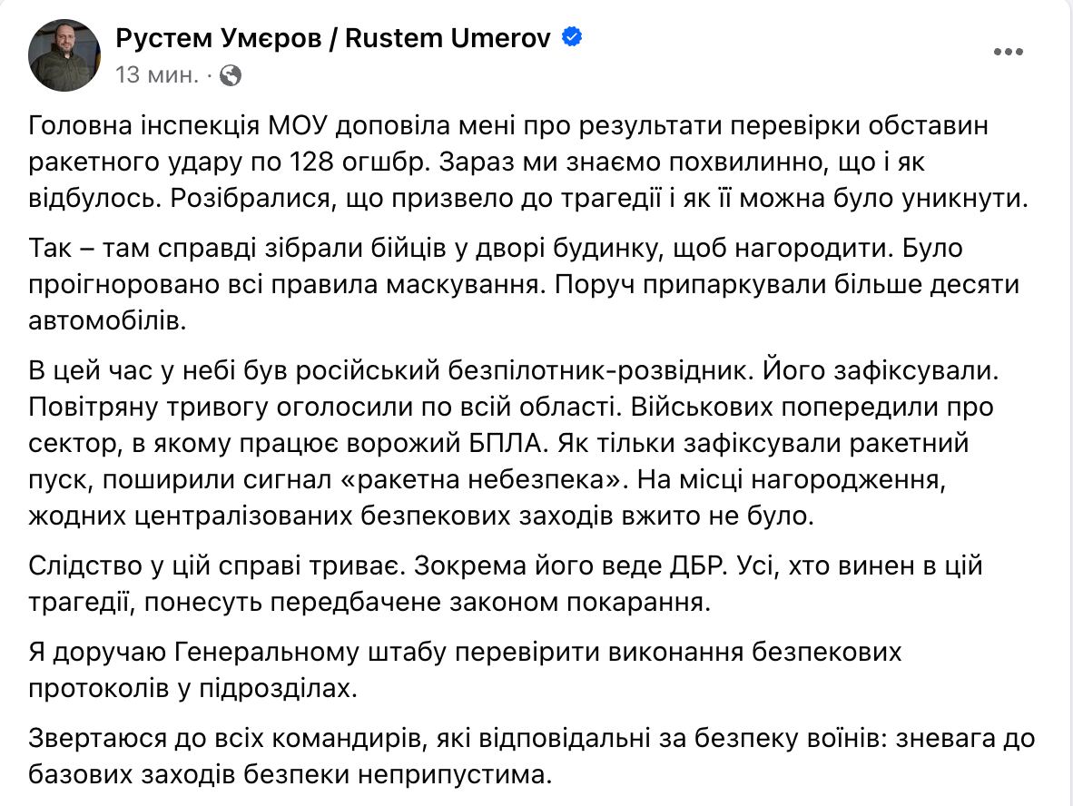 Министр обороны Рустем Умеров сообщил о результатах внутренней проверки обстоятельств ракетного удара по 128-й бригаде во время построения, когда погибли 19 бойцов.